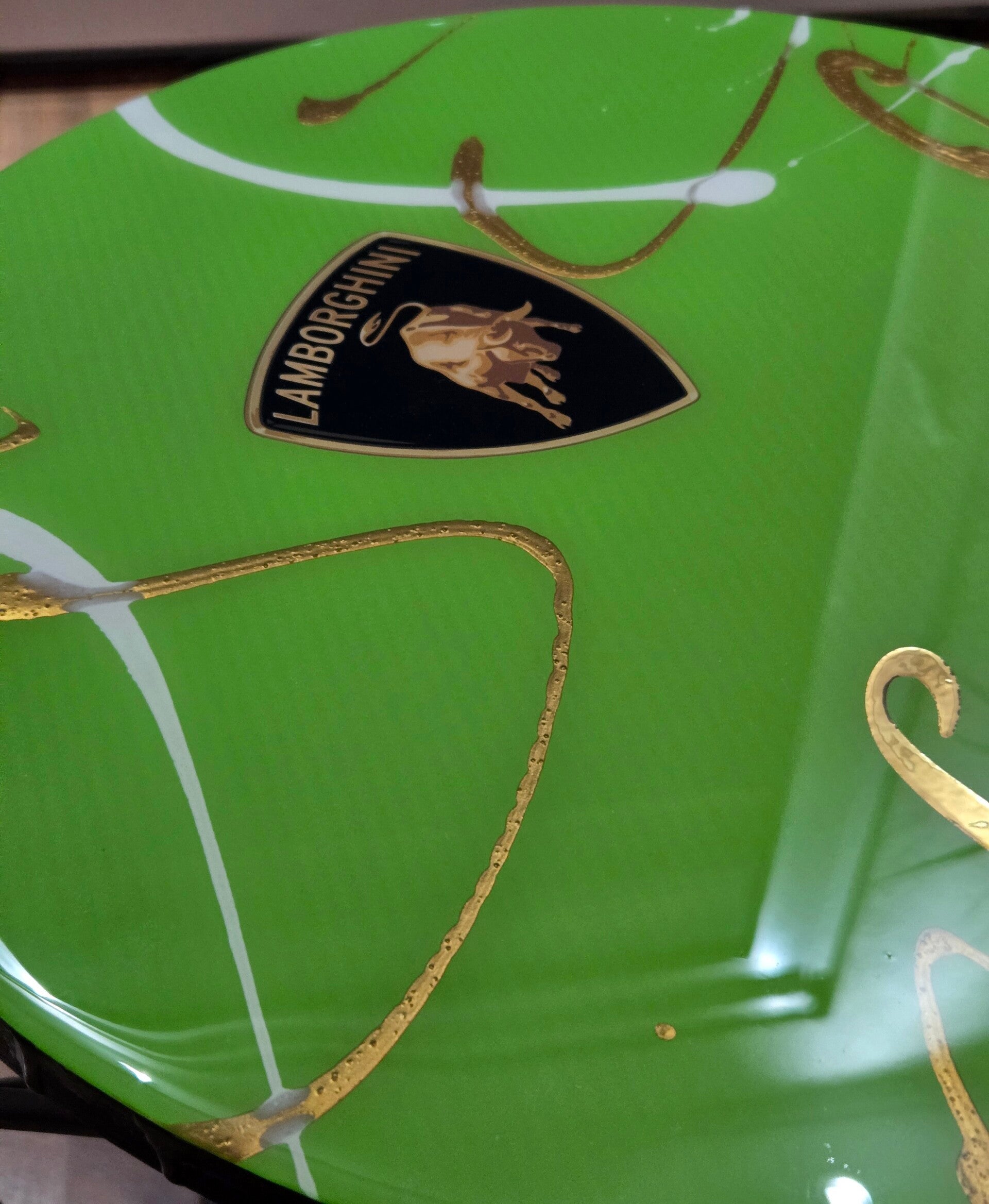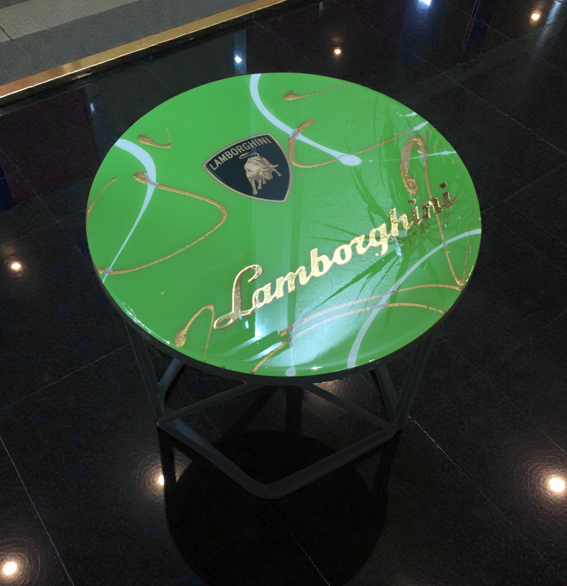 Die Tischplatte: Das Zentrum bildet das offizielle Lamborghini-Wappen, ergänzt durch einen dynamischen, goldenen Markenschriftzug. Die Oberfläche wurde mit einer hochwertigen Epoxidharz-Veredelung versiegelt, die dem Tisch eine beeindruckende Tiefe, brillanten Hochglanz und eine gläserne Haptik verleiht.