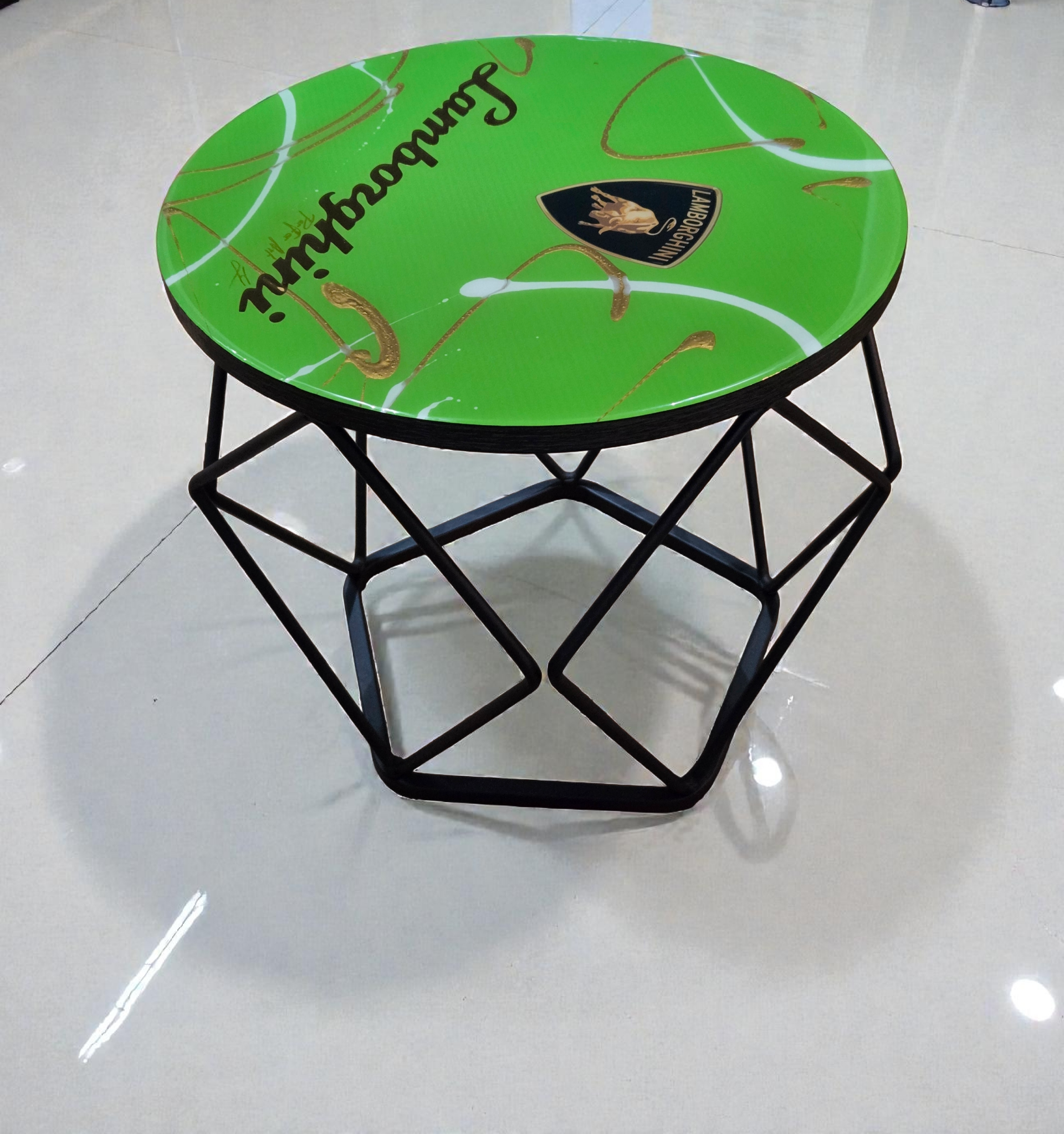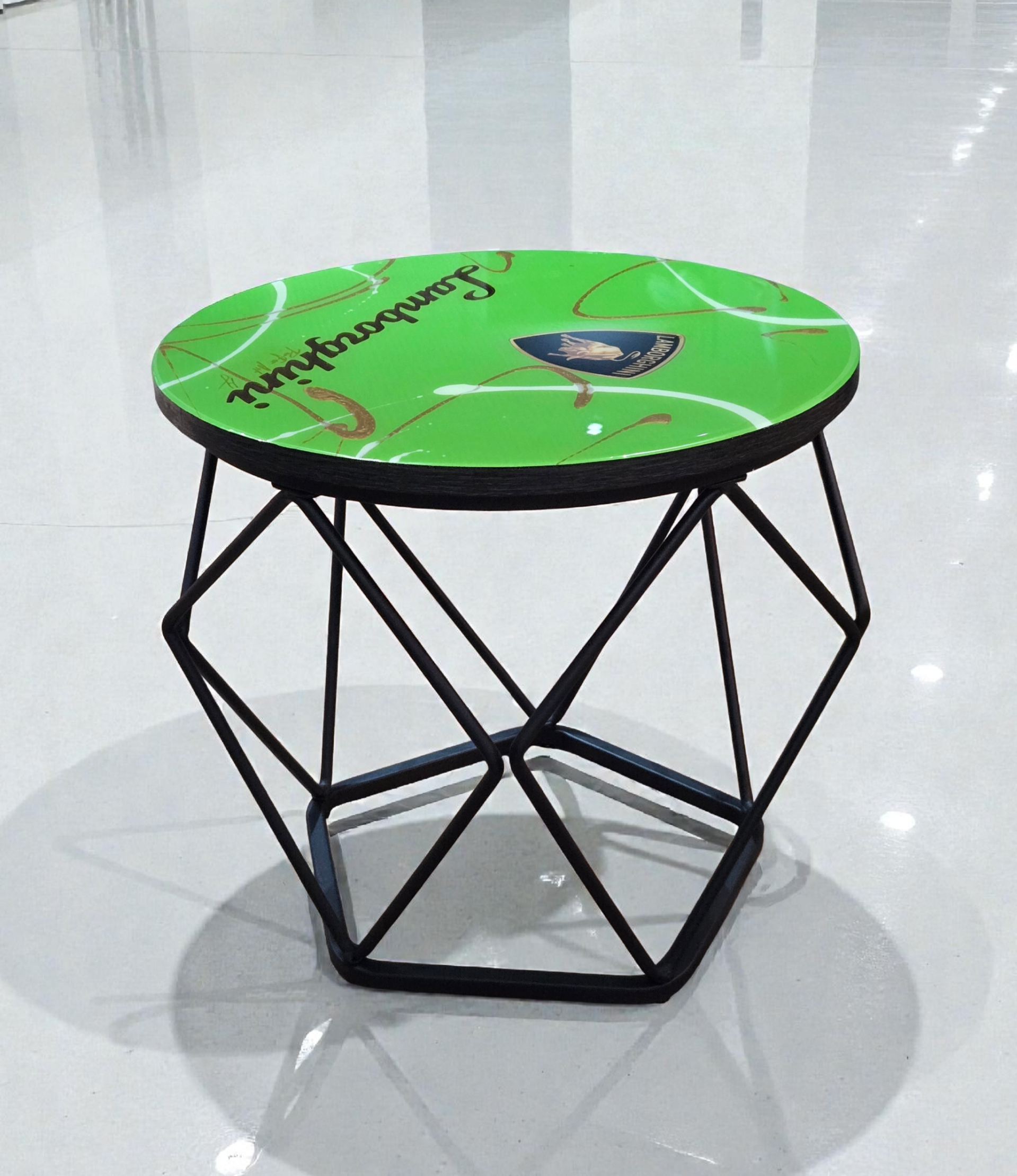 Dieses handgefertigte Unikat von PerFer Art (ca. 40 x 40 x 36 cm) vereint modernes Möbeldesign mit der Leidenschaft für automobile Luxusikonen. Der Tisch besticht durch seine markante, carbon leuchtend grüne Oberfläche, die als Hommage an die ikonischen Lackierungen der Marke Lamborghini interpretiert werden kann.